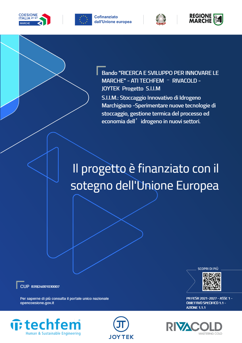 Techfem è beneficiaria di un progetto di Ricerca e Sviluppo finanziato nell’ambito del Programma Regionale MARCHE FESR 2021-2027 e cofinanziato dall’ Unione Europea, finalizzato alla realizzazione di un prototipo per lo stoccaggio a bassa pressione di idrogeno (H₂) su stato solido.
